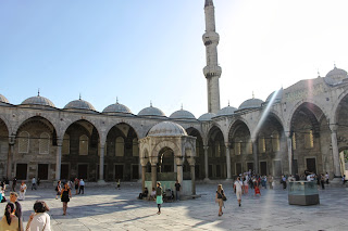 A caminhada pela praça do Sultanahmet, também chamada de hipódromo, lhe faz ver a Mesquita Azul rapidamente. É um entra e sai danado de gente, são turistas e também muçulmanos que lá vão para orar. A mesquita fica aberta até bem de noite, acredito que até às 21h. É muito gostoso estar passeando pelas ruas nos horários das orações, nas mesquitas ecoam músicas que mais se assemelham preces com um tom de choro para chamar os muçulmanos à oração.
